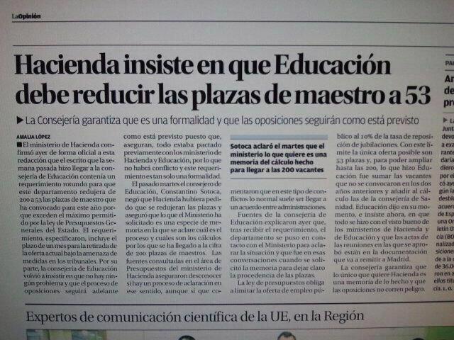A día de hoy, aún seguimos sin conocer la oferta final de plazas ofertadas a las oposiciones al Cuerpo de Maestros que se celebrarán en menos de dos meses. Tras las informaciones que señalaban que la Consejería había recibido hace pocas fechas un requerimiento de Hacienda para que se ofertaran 53 plazas en vez de las 200 anunciadas y aprobadas por el Consejo de Gobierno, y las declaraciones del consejero Sotoca de que se iba a solucionar el tema en “unos días”, a fecha de hoy seguimos sin noticias sobre un tema que afecta a los 10.000 inscritos en el proceso selectivo convocado en la Región.