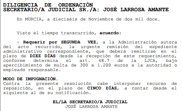 Hemos recibido notificación de nuestro servicio jurídico en el que nos informan que la sección 1ª del Tribunal Superior de Justicia de Murcia ha requerido POR SEGUNDA VEZ a la Administración autora del acto que recurrimos, el Consejo de Gobierno de la Región de Murcia, el expediente administrativo correspondiente que ya fue requerido pero tras el tiempo transcurrido, se ha solicitado de nuevo pero esta vez bajo apercibimiento de multa de 300 a 1.200 € que, de ser ejecutada, sería pagada con DINERO PÚBLICO, obvia y lamentablemente. Si saliera de sus propios bolsillos, otro gallo cantaría.