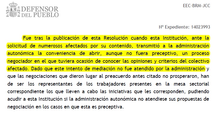 A ello, añade el Defensor del Pueblo que tras la publicación del decretazo de interinos en junio de 2013 “transmitió a la administración autonómica la conveniencia de abrir un proceso negociador”, y que “este intento de mediación no fue atendido por la administración”.
