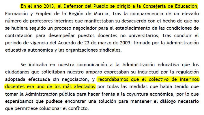 AIDMUR ha recibido una carta del Defensor del Pueblo, en respuesta a una carta previa en la que preguntábamos acerca de las actuaciones de este organismo ante el importante conflicto existente que ha condenado a la precariedad más absoluta y vergonzosa al colectivo docente interino de la Región de Murcia.
