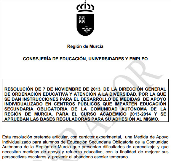 El consejero de Educación, Universidades y Empleo de la CARM, Pedro A. Sánchez ha iniciado una gravísima propuesta, QUE NO HA PASADO POR LA MESA SECTORIAL DE EDUCACIÓN, para que los alumnos de centros de enseñanza secundaria con dificultades de aprendizaje reciban apoyo educativo por parte de empresas o entidades privadas fuera de horario lectivo.